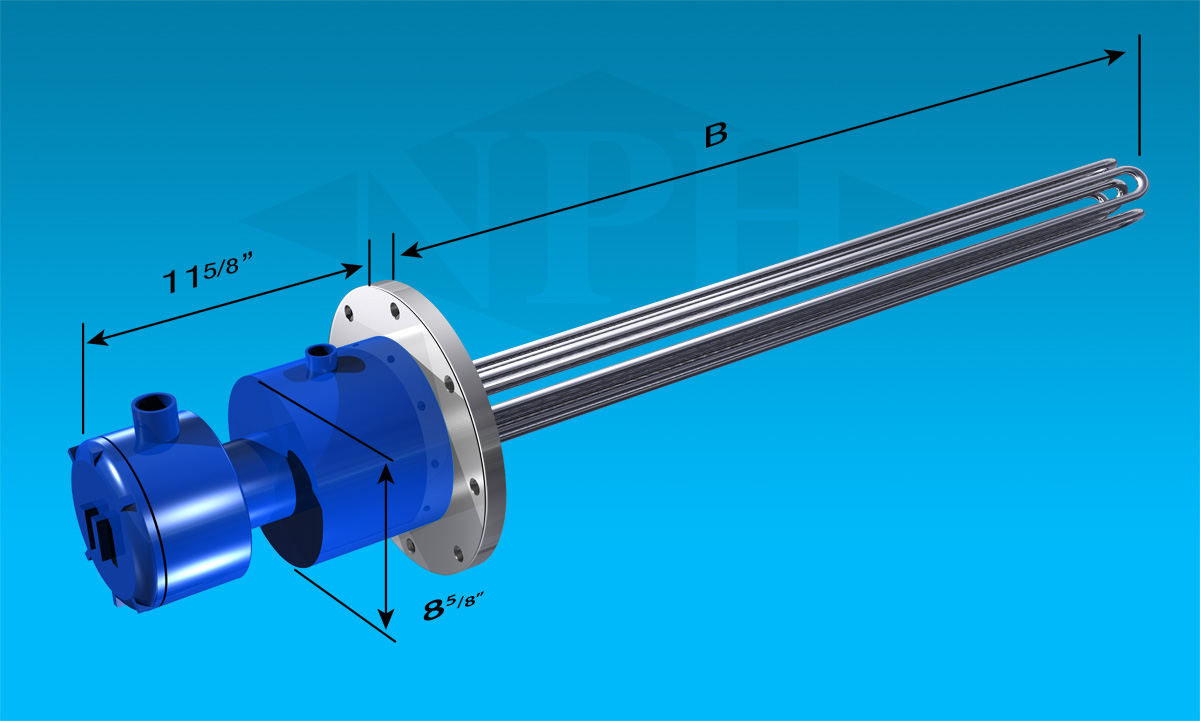 Standard Flanged Immersion Heaters have a 150 lbs flanges but 300 lbs flanges are also available. To guarantee sheath material and watt density compatibility with material or process being heated consult NPH. All flanged immersion heaters we offer you including heaters for hazardous locations are CSA/NRTL and UL approved.